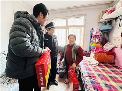 本报1月24日讯 “让老人们过一个愉快的年,是我们大家共同的目标。”每逢佳节倍思亲,青岛市公安局市北分局兴隆路派出所社区民警马怀龙清楚,老人们都盼着过节能有人陪在身边。每年临近春节时,马怀龙都会去看望孤寡老人。24日上午,马怀龙又带领青岛公安金盾志愿服务队,携手爱心企业走访辖区困难群众。