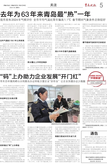 刚刚过去的2024年,我市气候条件如何?24日,青岛市生态与农业气象中心(青岛市气候变化中心)发布2024年气候影响评价,显示去年我市平均气温比常年偏高1.1℃,为1961年以来历史最高。全年出现暴雨、台风、高温、雨雪、寒潮和大雾等天气气候事件。整体来看,2024年我市气候年景一般。