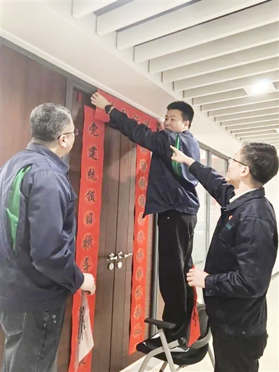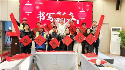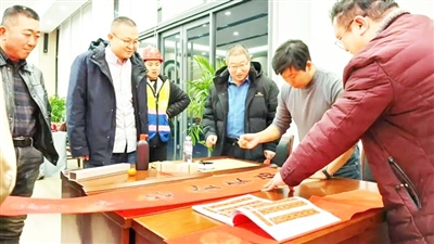 十天前,项目上的工人陆续返乡。按照规定,他们的工资会在25日打到工资卡里。“没有一个工人来找我们说担心工资和奖金发放不及时。大家收拾好行李高高兴兴回家了,他们知道,日子到了工资肯定会准时打过去。”姜杰说,半年多的朝夕相处,让他们和工人之间建立了极大的信任,有工人说,过完年要带自己的工友一起来“投奔”青岛地铁。朱文普是工人里走得最晚的,因为他想给工地上留点“心意”。“我小时候学过书法,在家逢年过节也帮邻里写春联。我就想着,手写的春联更有诚意,就主动跟项目领导说,‘我给你们写点春联吧’,没想到很受欢迎。”小年之前,项目上还专门为他办了一个“书写新春”的小仪式,大家把他围在中间,央着他写了三四十幅。“给人写春联很多年了,办仪式还是第一次!”朱文普说。