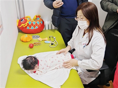 14日上午,儿童早期发展中心里暖意融融,妈妈们抱着满月的宝宝有序排队等候,脸上洋溢着幸福的笑容。医护人员们也早早做好准备,以饱满的热情迎接这些可爱的小生命。