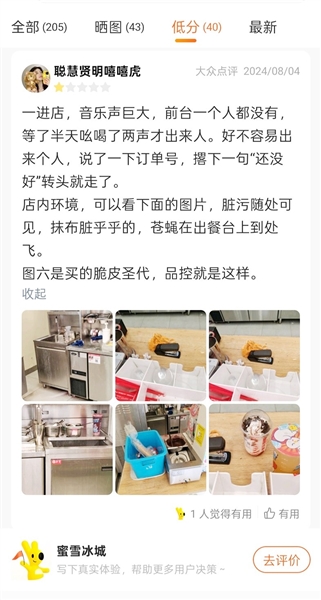 差评或低分评价大致可分为三类,一是门店服务不到位,如“订了四十五杯奶茶只给三十几根吸管”“糖没搅均,下半杯甜得发腻”“到店取餐,店员爱答不理”。二是消费者对产品质量不满意,如“只有半杯”“冰淇淋全是冰”“草莓酱异味”“奶茶像兑了水”。三是门店卫生堪忧,“抹布脏乎乎的,苍蝇在出餐台到处飞”“吃出异物”。