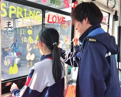 6路线作为一条沿海旅游观光线路,途经多处著名旅游景点,6路线555号车打造“寻找春天”主题车厢,将樱花、迎春花、玉兰花等春日美景“搬”进了车厢,春日气息扑面而来。 (青岛晚报/观海新闻/掌上青岛记者 徐美中)