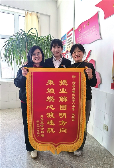 3月13日,阳光倾洒在崂山八中校园,青岛旅游学校2022级学生于小淇,手捧绣着“授业解惑明方向 秉烛燃心渡迷航”的锦旗,在青岛旅游学校办公室副主任李艳芳、班主任张淑珍的陪伴下,重返阔别两年的初中母校。于小淇在2024年世界职业院校技能大赛争夺赛导游服务赛项中勇夺银奖,此次归来,要向昔日班主任王桂云致谢,感恩初中三年的培育之恩。