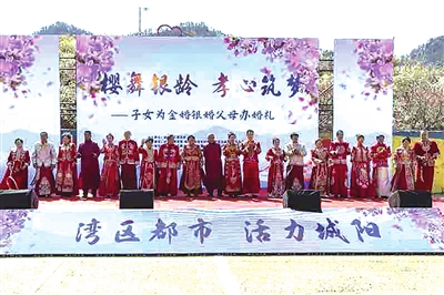本报3月30日讯 近日,城阳区“樱舞银龄 孝心筑梦”——子女为金婚银婚父母办婚礼主题活动在夏庄街道“山色峪爱情谷”温馨启幕。