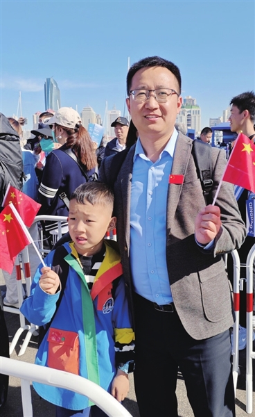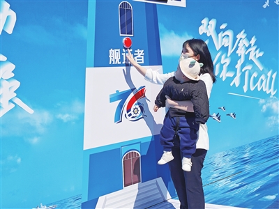 人群中,8岁的尹百臻挥舞着国旗,雀跃着让母亲给他拍照。尹百臻来自哈尔滨,梦想是入伍当一名海军,他对各类舰艇如数家珍。得知舰艇开放活动的消息,他的母亲网上预约成功后,替他向学校请了假,22日坐飞机来到青岛。家住济南的邱朋勇父子则是选择了坐高铁来青。邱朋勇告诉记者,舰艇开放活动是一次很好的国防教育机会,能让孩子自小树立强军强国梦想。因此,预约成功后他特意向单位请了假,带着儿子前来参观。