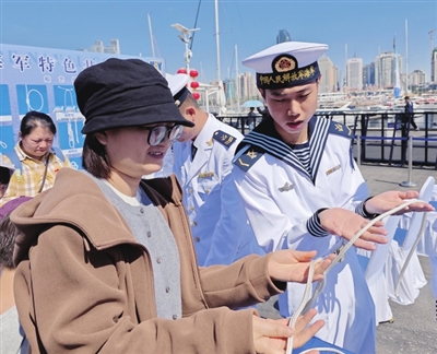 市民游客手拿国旗,满怀期待地登上舰艇,在讲解员的带领下,有序参观各艘舰船的飞行甲板、武器装备等部位。在码头区域,市民们纷纷打卡照片墙、盖章、签名留念,还有很多人深度体验了特色旗语、打绳结、穿戴防护服等海军特色科目。舰艇开放活动极大地拉近了民众和海军的距离,全面增进了民众对中国海军的了解。记者注意到,现场不少人是第一次登上军舰,大家坦言,以前只通过视频、照片等了解军舰,现在有机会近距离参观,感觉非常震撼。