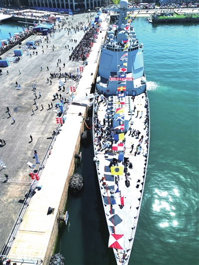 情系浪花白,最美海军蓝。4月23日是人民海军成立76周年舰艇开放活动的第一天,一大早,从全国多地赶来的观众就守候在了青岛奥帆中心码头和青岛港3号码头,近距离感受海军战舰的威武和海军战士的风采。
