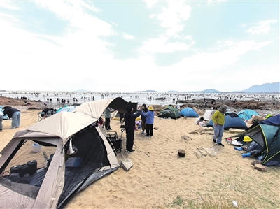“我之前在抖音上刷到会场赶海园的攻略,正好趁着五一假期,带两个孩子来赶海。”淄博游客林女士一家5月1日自驾来青,当晚住在会场赶海园附近的一家民宿,晚上10点多退潮后,她家的两个孩子就套上涉水服和雨靴,带上小桶、耙子和铲子,开始在沙滩上“挖挖挖”了。第二天上午10时许,林女士一家又来到会场赶海园,爸爸妈妈在沙滩上露营,9岁的王道轩和姐姐则专心在退潮后的沙滩“寻宝”。“青岛特别美,而且很适合带娃家庭出游。比如赶海,小朋友连玩两天都不会腻。”林女士笑称。
