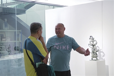 因为好奇,朱振洪去年踏进了烟涧村,一眼就看中青铜这种材料的“文化重量”。“青铜器在中国不是简单的器物,是‘神器’‘礼器’,是礼与神的媒介。”而在青岛的展览中,他特别展出一件仿古青铜“大哥大”展品。这件在青岛昌乐路市场淘来的上世纪90年代通讯工具,被工匠铸成青铜质地,就像给文明拍了张错位的合影。朱振洪透露,他的下一个仿古青铜器的展览,会有更多全新的创作。
