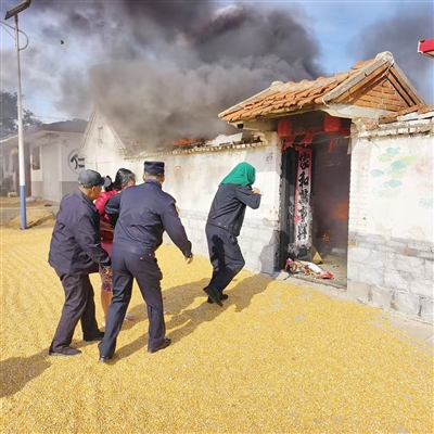 “我们当天是走访社区,帮群众检查家中安全,询问是否有困难。”莱西市公安局龙水路派出所社区民警王太雷回忆了当天的一幕:上午10时许,他和辅警张吉信、王磊、李荣栋走访到烟青公路一村庄时,突然发现村中冒出滚滚浓烟。四人立即奔赴现场,只见一名村民家中起火,浓烟从院子里不断冒出。