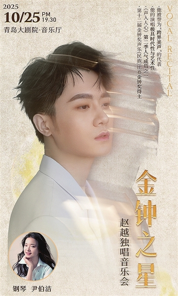 10月25日晚,青年男高音赵越“金钟之声”独唱音乐会将在青岛大剧院上演,作为青岛大剧院2025年度重点公益品牌——“我的祖国”音乐季的闭幕演出,为这个持续半年的音乐盛宴画上圆满句号。