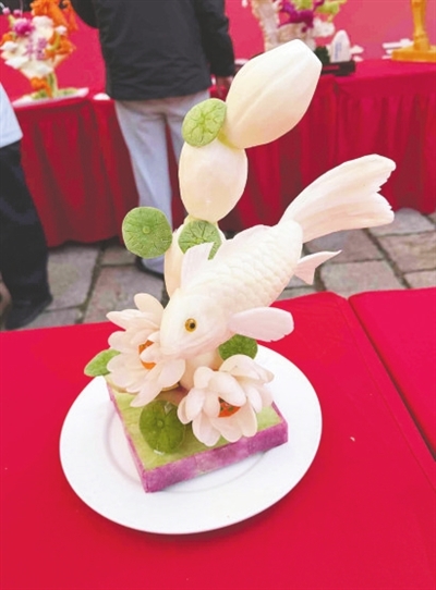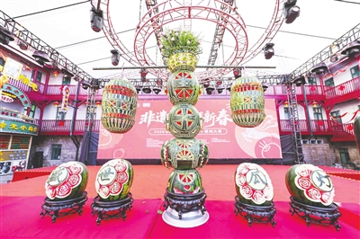 在现场,一件名为“盛世瓜灯”的作品一亮相,便让观众挪不开眼。它的创作者是食雕非遗代表性传承人、岳氏食品雕刻工作室负责人岳振东,他与萝卜、西瓜等食材打了20多年交道,多次在雕刻大赛中夺魁,还曾带着一手绝活走进联合国总部献艺。这件作品由11个西瓜雕琢而成,由岳振东带领徒弟耗费20多个小时制作完成。“主灯运用了木雕里的榫卯结构,挂灯可以像手风琴般拉伸。以往瓜灯里点的是蜡烛,现在我们改用LED射灯,不怕风,照明时间更长。”岳振东介绍,食雕技艺也要不断创新与时俱进,但不变的是在方寸之间精雕细琢的匠心。