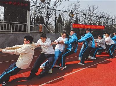 拔河赛场则上演了力量与团结的终极比拼。八年级各班组建20人男女混合战队,队员们紧握长绳、脚蹬地面、身体后倾。随着哨声吹响,双方队员咬紧牙关、寸土必争,绳子中间的标记线左右移动,牵动着全场师生的心。班主任在场边呐喊指挥,观赛同学加油声震耳欲聋,每一场比拼都酣畅淋漓,完美诠释了“团结就是力量”的深刻内涵。