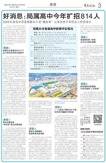 在昨日举行的2026年青岛市高中招生工作新闻发布会上,市教育局相关负责人表示,推动高中优质特色多样发展是国家对普通高中教育的鲜明导向,特色班不是重点班,学校组建特色班,要突出学生的志向兴趣、学科优势等因素,以尊重学生的意愿为前提。学校对特色班要加强课程支撑、平台搭建,均衡师资配置,努力满足学生发展需要。