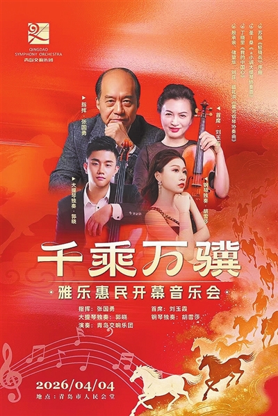 4月4日19:30,与青岛大剧院遥相呼应,青岛市人民会堂也有一场音乐盛宴——“千乘万骥——雅乐惠民开幕音乐会”在此启幕。作为雅乐惠民系列演出的重要组成部分,本场音乐会由著名指挥家、青岛交响乐团音乐总监张国勇执棒,青岛交响乐团室内乐团艺术总监、中国海洋大学教授刘玉霞担任首席。青岛交响乐团倾情演奏,汇聚郭晓、胡雪莎等一众知名演奏家,以恢弘交响传递艺术温度。