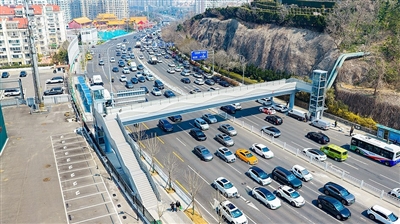 两座天桥投入使用,消除了人车混行安全隐患,为车辆快速通行创造条件。为适配双山隧道通车后形成的区域交通新格局,切实保障重庆路、黑龙江路方向进出主城区车辆的高效通行,市公安交管部门联合设计、建设等单位,对福州路(奉化路至敦化路段)实施交通组织系统性优化改造,全面提升道路整体通行效率。