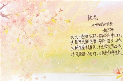 | ▲指导老师王韵涵点评:桃花盛放,映红城郭,气势明朗,不媚俗、不借娇态取悦人的品格令人赞叹。颈联由花及景,春色满溢,画桥流光,十分有画面感。桃花一诺,情致悠长,我们能从诗中真切感受到作者的细腻情思。 |