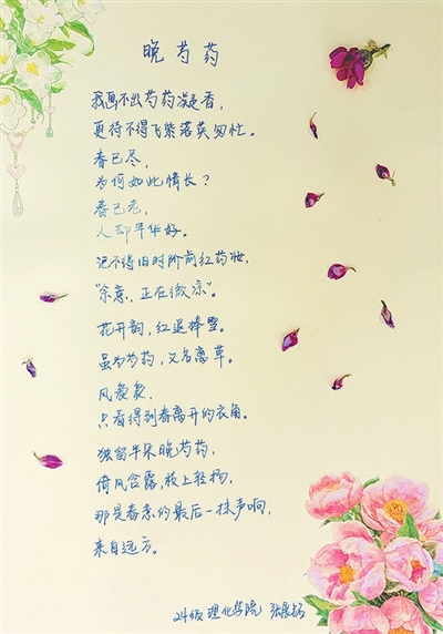 | ▶指导老师耿亮点评:诗歌以残春芍药为引,将惜春之情与年华之思作为主旨。红退捧雪,勾勒出芍药傲然的姿态;末句以芍药敲窗收束,把无形的春意化作可感的声响,余韵悠长。全诗意境清丽、情感细腻,很有诗意。 |