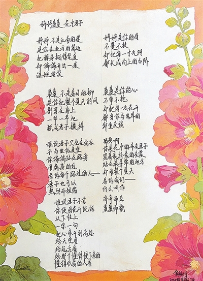 | ◀指导老师张雨欣点评:这首咏蜀葵的诗,将花“婷婷”的形态与君子风骨相融,颇具古典意蕴,又能别出机杼,写出新意。开头打破君子幽居避世的传统写法,凸显蜀葵热烈坦荡的特质,结尾又以“布衣君子”赞美其坚守本心的品格,立意高远。全诗语言清丽流畅,韵味深厚而落笔灵动。 |