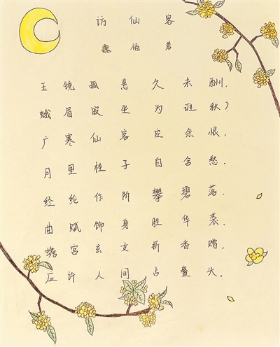 | ▶指导老师李菁点评:此诗以“蟾宫折桂”为核心,饱含对高三学子的祝福之情,构思精妙。首联营造出月宫清寂之境,暗衬桂花清雅的特点。“经纶作阶”“曲赋饰身”将抽象学识化为具象阶梯与华服,比喻新颖贴切。尾联直接点明少年意气,展现了高中生特有的锐气。 |