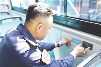 本报4月14日讯 近年来,青岛公交持续推进新能源车辆更新升级,一批批环保、便捷、舒适的纯电动新能源公交车穿梭在城市的大街小巷,不仅为市民出行注入绿色活力,更在细节处不断优化服务。公交市北三分公司近日贴心配备共享充电线,让流动车厢变身“移动共享充电宝”,切实缓解市民出行中的“断电焦虑”。