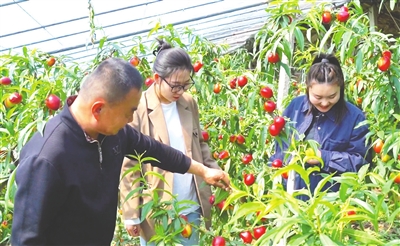 记者走进西山前村果农初旭光的油桃大棚,满眼春色、红绿相映,颗颗圆润饱满、色泽鲜亮的油桃鲜果早已挂满枝头。得益于品种更新与科学管护,尤其是精准控温、地面覆膜、水肥一体化等技术运用,今年,他家的油桃挂果早、着色好,成为村里首批成熟的设施油桃之一,看货订购都要提前预约,供不应求。
