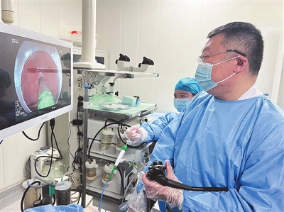 王先生接受的内镜下胃转流支架置入术由该院消化内二科、内窥镜中心主任贺延新团队实施。手术过程很简单:在无痛胃镜下,经口腔将一根约60厘米长的套管膜支架精准放置在十二指肠及空肠上段。支架就像一个“物理隔离层”,让食物绕过部分胃和十二指肠,减少糖和脂肪的吸收,同时还能调节肠道激素,增强饱腹感、改善胰岛素抵抗。