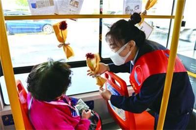 早报10月25日讯 农历九月初九是中国的传统节日重阳节。为营造敬老孝亲的良好氛围,青岛公交26路线打造“情暖重阳”主题公交,车内布置主题图片、主题诗词及介绍节日习俗的文字等内容,还向老年乘客免费送上鲜花和放置健康码的专用卡套,温暖的车厢服务让登车的老年乘客们笑开怀。