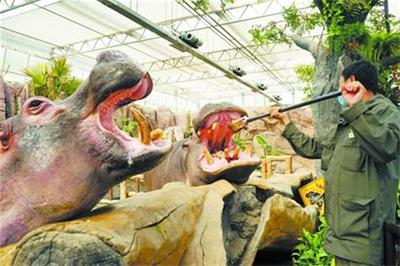 “河马属于杂食动物,平常需要人投喂、洗澡、刷牙……所以它们与饲养员每天接触时间最长。 ”保育员薛见芳把早报记者带到河马饲养区,一边给河马刷牙一边介绍情况。这两只分别重达2-3吨的大嘴兽,嘴巴最大开合能达到90°,是园区里有名的“大胃王”。