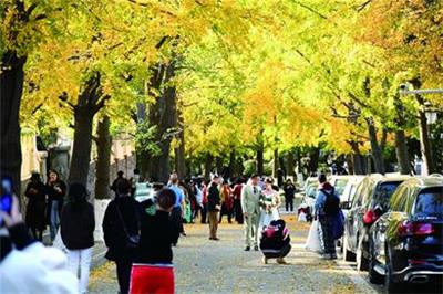 居庸关路上,市民和游客或是悠闲踱步于这条“黄金大道”,或是细细捕捉落叶坠下的瞬间,还有新人们来到这里拍摄婚纱照,来到这里的人们,都被这种浓郁的诗意所浸染。