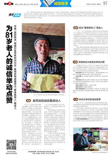 昨天,“西海岸新区81岁老人崔西武搭乘出租车,走村串户给26年前的工人结算工资欠款”报道在《青岛早报》上见报后,引起了市民的热烈讨论,大家纷纷为崔老板的诚信举动点赞……青岛交通广播《交通热线》栏目分别连线了当时的出租车司机徐师傅和青岛早报记者,向听众讲述了这件事的全过程。另外,崔西武家所在的西海岸新区隐珠街道党工委也整理了解老人的还钱事迹,将推荐他为2021年度“最美隐珠人”候选人。