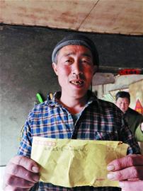 昔日工友张洪文展示崔西武送来的装有工资的信封。