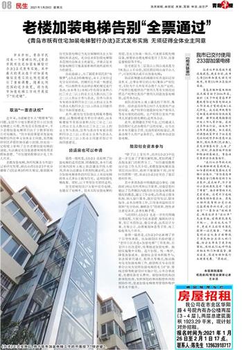 “我们从去年秋天就开始期盼新政策的到来,如今看到新政策落地大家都十分高兴。 ”家住青岛市市南区金门路街道的于女士表示,在采访中,不少老旧小区的居民直呼 “看到了希望”。拍手称赞的不光是老百姓,还有不少岛城老楼电梯加装企业。青岛云梯科技有限公司行政总监蒋南告诉记者,过去由于“一票否决”制的存在,确实让许多“准订单”无法实施,前期居民意见不统一,企业也无从下手,更谈不上后续为居民提供一站式服务。 “新政策的出台从各方面降低了居民和企业准入的门槛,给企业带来了更多的商机,同时我们也呼吁政府相关部门加强监管、驱劣逐良,促进电梯加装行业健康发展。 ”蒋南说。