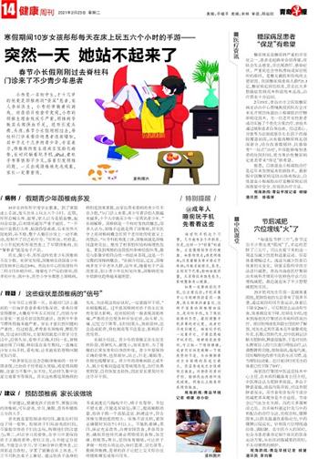 今年节后上班第一天,孙刚对门诊上遇到的一位16岁患者希希印象深刻。希希经常觉得腰疼,大概有半年左右时间了,但因为学业紧张一直没有前往医院就诊,直到今年春节腰疼得越来越严重,家长才意识到问题的严重性。经过检查,希希患有颈椎病、腰肌劳损,经过询问得知,主要原因就是日常学习生活中,经常久坐、姿势不正确,时间一长,脊椎就出现了问题。特别是在春节期间,一直瘫在沙发上玩手机、看电视,让本就有的脊椎问题更加凸显。