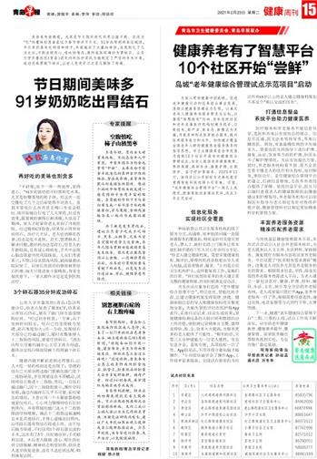 为深入贯彻健康中国战略,促进老年健康行动和医养结合事业发展,围绕以健康青岛建设为引领,以满足老年人健康养老服务需求为目标,以推进“智慧助老”行动、老年友好社区和老年友善医疗机构创建为抓手,以新技术、新产业、新业态、新模式为支撑,开展多种形式医养结合服务,提升医养服务能力和水平,加快建立覆盖全体老年人群的健康养老服务体系的指导思想,市卫生健康委在全市范围内选取10个社区开展老年健康综合管理试点,为老人提供老年健康教育、预防保健、疾病诊治、康复护理、长期照护、安宁疗护等服务。 2020年11月,该项目以公开招标方式委托南京孝德智能科技有限公司实施。目前,“老年健康综合管理平台”一期已上线使用,配套智能设备铺设完毕,试点工作正式启动。