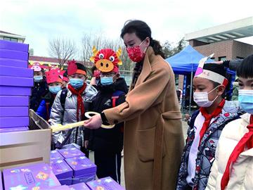 青岛博文小学的学生们戴着“牛角”踏入校门,与校长一起打开藏宝箱。