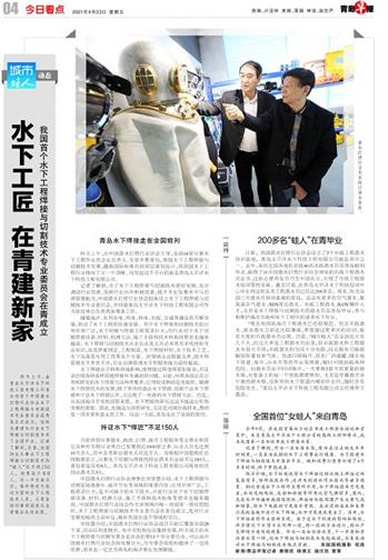 陈洋介绍,水下环境使得水下焊接过程比陆上焊接过程复杂得多,除焊接技术外,还涉及到潜水作业技术等诸多因素。相比普通水下工程作业有所不同,水下焊接技术可见度差,水对光的吸收、反射和折射等作用比空气强得多,因此,光在水中传播时减弱得很快,焊接时电弧周围产生大量气泡和烟雾,使水下电弧的可见度非常低。在淤泥的海底和夹带沙泥的海域中进行水下焊接,水中可见度就更差了。另外,水下焊接连续作业很难实现,由于受水下环境的影响和限制,许多情况下不得不采用焊一段,停一段的方法进行,因而产生焊缝不连续的现象。作为一名女性潜水员,下一步要和男性潜水员一样,向水下焊接与切割技术发起挑战,为青岛海洋水下焊接与切割技术做点贡献。 本版撰稿摄影 观海新闻/青岛早报记者 康晓欢 杨博文 通讯员 郭策
