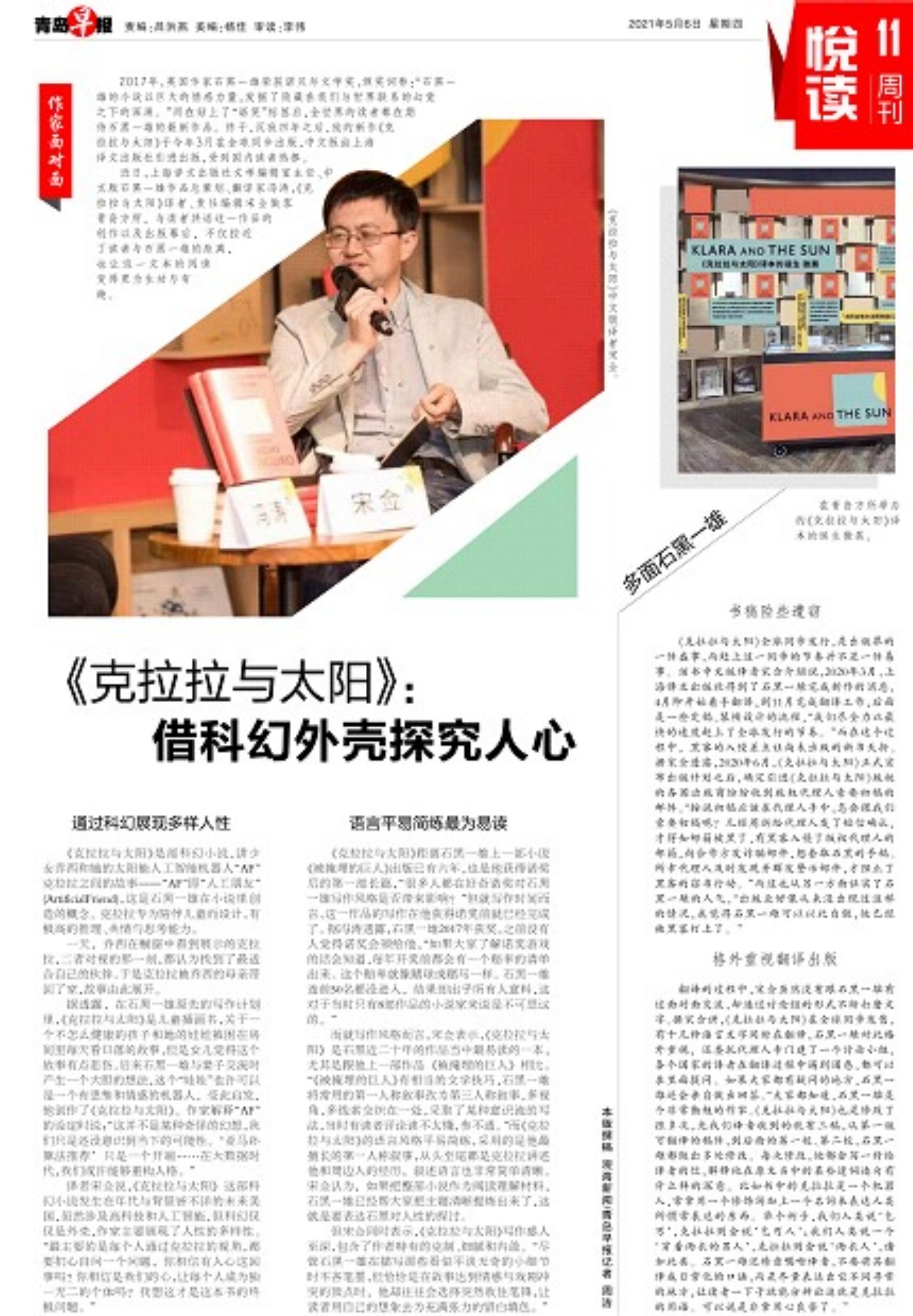 近日,上海译文出版社文学编辑室主任、中文版石黑一雄作品总策划、翻译家冯涛,《克拉拉与太阳》译者、责任编辑宋佥做客青岛方所,与读者共话这一作品的创作以及出版幕后,不仅拉近了读者与石黑一雄的距离,也让这一文本的阅读变得更为生动与有趣。《克拉拉与太阳》中文版译者宋佥。