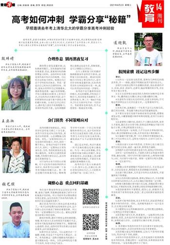 高考在即,在最后的静悟、冲刺时间里如何复习才能事半功倍,考出理想的成绩?怎样做才能克服紧张情绪,全身心投入应考之中?近日,记者采访了去年青岛二中、青岛五十八中考入清华大学等知名高校的“学霸”,为今年的高三学子分享备考经验。