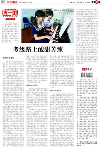 “很多人感到好奇,为何孩子学了这么久却一直没考过级。 ”徐女士回忆,其实并没有刻意为之,而是恰巧在每年暑假考级的时间点上,她都安排了和女儿的出游计划,上小学的这几年,女儿几乎游遍了全世界。直到去年,因疫情取消了出游计划,徐女士才第一次认真考虑女儿是否要考级。 “最初只觉得学琴能为她打开艺术的一扇窗,可以欣赏到更多的风景。为啥一定要让她参加考级?”徐女士坦言,情况转变是在三四年级的时候,随着课业压力和学琴难度同时加大,女儿练琴到了一个瓶颈期,很难二者兼顾。 “一遍遍学不会、练不好,她会有挫败感,同时也不清楚自己达到了什么水平,有些看不清前进的方向了。 ”但当徐女士提议让孩子以学业为主,暂时放弃弹钢琴时,曹楚薇拒绝了,弹钢琴已经成为她日常生活中不可缺少的一部分。于是,考虑再三,经过精心准备,曹楚薇在去年暑假第一次参加了钢琴考级,并且一次便顺利通过了六级。