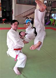 徐殿平(左一)给学员展示柔道技巧。资料照片