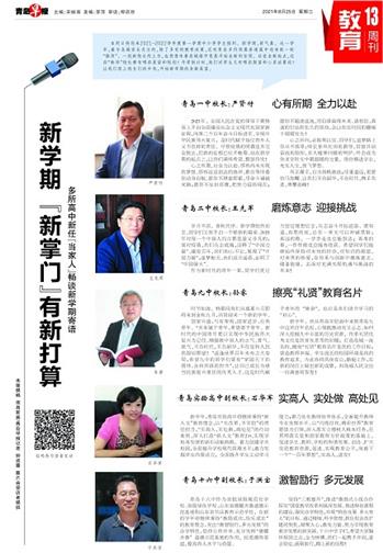 新学年,我从青岛实验高中来到青岛九中这所百年名校,心情既激动而又忐忑。如何深入挖掘九中丰富的历史资源,传承礼贤优秀文化是我首先思考的问题;打造岛城一流名校,擦亮“礼贤”教育名片是我的工作目标;营造教师幸福、学生成长的校园环境是我的教育追求。为此我将夙夜在公,勤勉工作,在新的岗位上做出新的成绩,向岛城人民交出一份满意的答卷!