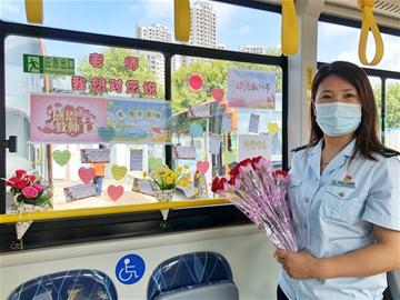 “乘客您好,您乘坐的是‘感恩·教师节’主题宣传车,您既可以分享师生故事,也可以取用车内鲜花送给老师。 ”在驾驶员的提示下,乘客们纷纷抬头浏览相关内容,回忆起自己的学生时代,提笔写下师生之间的温暖故事。据了解,该主题宣传车由市南巴士六分公司“一路相伴”志愿者们利用业余时间打造,希望以此激发学生的感恩之心,营造尊师、爱师的浓厚氛围。 “104路线经过青岛电子学校、第五十九中学、台湛路小学和基隆路小学,我们在花篮里放置了一些鲜花,学生乘客可以随时取用,向老师们表达真挚情感。 ”六分公司党支部副书记臧虹介绍。