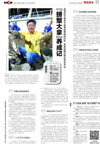 “在青岛打工时,我就发现青岛人特别喜欢吃螃蟹,渐渐地我也被这种情怀感染了,也迷上了螃蟹生意。”郭弟平认为,青岛人的螃蟹情结,丝毫不亚于每年谷雨时节的鲅鱼情结,“鲅鱼也好,螃蟹也罢,其实都是一种文化载体,说明了青岛人重情重义,懂得感恩,这种真诚值得让人尊敬。 ”