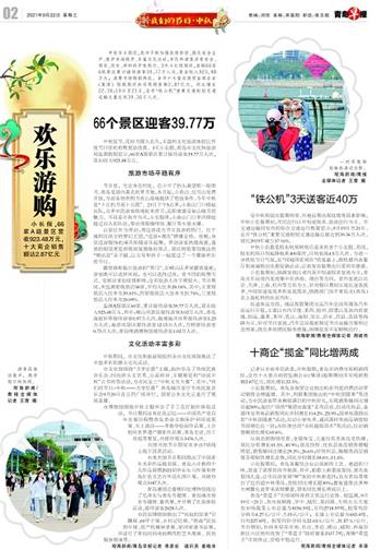 中秋节日期间,我市不断加强疫情防控、强化安全生产、维护市场秩序、丰富文化活动,市民和游客共享安全、稳定、快乐、祥和的中秋假日。3天小长假期间,岛城66家A级景区累计接待游客39.77万人次,营业收入923.48万元;消费市场购销两旺,全市十大重点商贸监测企业(集团)假期期间共实现销售额2.87亿元,同比增长22.3%;19日至21日,全市“铁公机”重要交通枢纽交通运输总量达到39.36万人次。