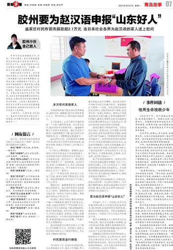 团圆日却成了分别日,赵汉语用生命谱写了人间大爱。青岛早报第一时间报道了赵汉语的英勇事迹,这种舍己救人的精神感动了许多人。在青岛早报的联系下,黄晓明真心英雄公益项目为赵汉语一家颁发了10万元善款,奖励赵汉语的见义勇为行为。早报记者从胶州市文明办了解到,为赵汉语申报道德模范的材料已经收到,后期还将为赵汉语申报青岛市文明市民、山东好人等荣誉称号。胶州市见义勇为协会也收到铺集镇的申报材料,将加快对赵汉语见义勇为先进个人的申报。