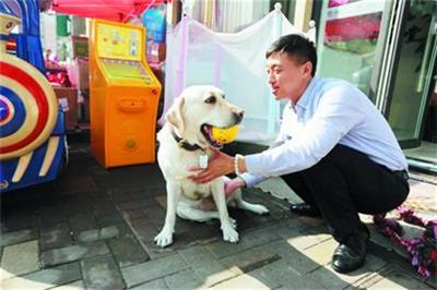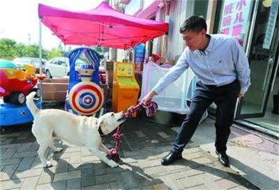 “Karry是个乖孩子,今天要好好表现哦。 ”在位于巨峰路的祺幼堂小儿推拿店门前,周家名结束了一上午的推拿工作,带着导盲犬Karry做游戏。和普通的拉布拉多犬一样,Karry喜欢仰着身子求抚摸,时常把头搭在周家名的脚上,惬意地咬玩身边的小球。拔河、捡球,每当Karry完成一项任务,周家名便会俯下身子,轻抚它的头,或者喂它最爱吃的狗狗零食作为奖励。