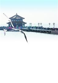 ▲栈桥景区的海鸥吸引游客喂食、拍照。