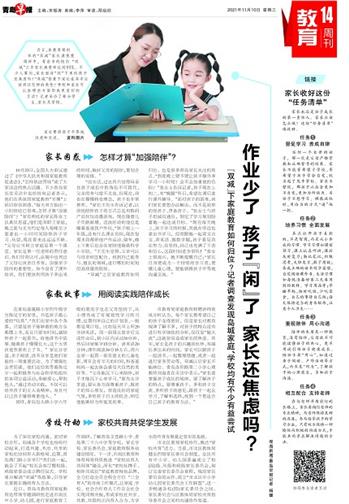 “双减”之后家庭教育如何归位,也是很多青岛家长关注的焦点。“到底晚上要不要让孩子额外多学习一小时呢?会不会加重他的负担? ”张女士告诉记者,孩子现在上初二,有“瘸腿”科目,希望在课后进行课外辅导。 “面对孩子的困难,我们家长要想办法解决,而不是简单的怪孩子、责备孩子。 ”张女士与孩子坦诚沟通后,制定了学习规划陪着她一起达成目标。 “现在每天晚上,孩子学习的时候,我就在旁边也拿出书学习,经常跟她一起背文言文、背英语、做数学题,孩子看见我在努力、在坚持,自己也充满了干劲和信心,这段时间进步很快! ”张女士很高兴,她不断提醒自己:“家长自身要成为一个持续的学习者,要懂儿童心理,要能够跟孩子平等地沟通交流。 ”