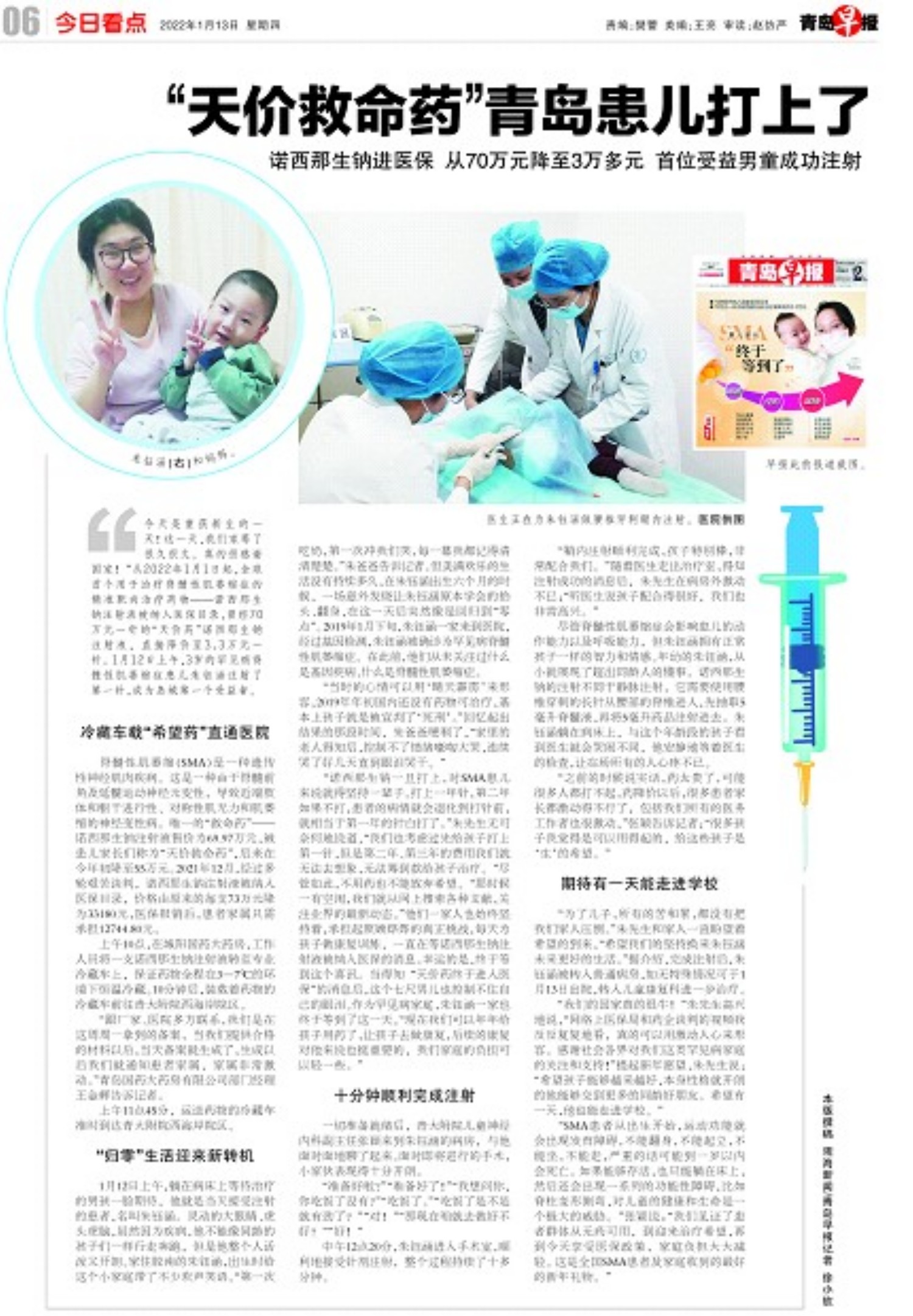 “为了儿子,所有的苦和累,都没有把我们家人压倒。”朱先生和家人一直盼望着希望的到来,“希望我们的坚持换来朱钰涵未来更好的生活。”据介绍,完成注射后,朱钰涵被转入普通病房,如无特殊情况可于1月13日出院,转入儿童康复科进一步治疗。